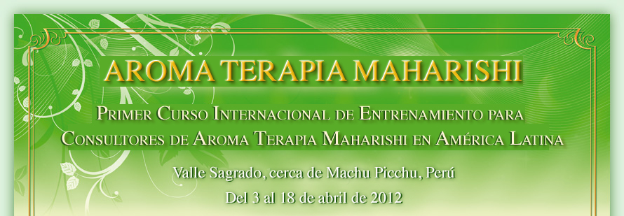 INTERNACIONAL PARA FORMAR EXPERTOS EN AROMATERAPIA MAHARISHI El Departamento de Aroma Terapia (ATM) de la Universidad Maharishi para Salud Perfecta cordialmente invita a todos aquellos interesadosen el fascinante conocimiento y experiencia de Aro...ma Terapia Maharishi con los aceites esenciales más puros y de la más alta calidad encontrados en el VedAroma, y que le gustaría aplicar este conocimiento como consultores de aromaterapia Maharishi o como expertos en la comercialización de los aceites esenciales VedAroma. Nuestros Cursos Internacionales de Entrenamiento en Aroma Terapia Maharishi anteriormente realizados durante los últimos dos años en Provence en Francia, en la Ciudad Védica Maharishi en Fairfield, y en el Brahmasthan de la India han tenido un éxito rotundo, así que estamos encantados de anunciar nuestro primer curso de ATM para América Latina, cerca de la famosa ciudad antigua de los Incas, Machu Picchu, Perú. Personas de todo el mundo están invitadas a unirse a nosotros en este hermoso lugar. Fechas: